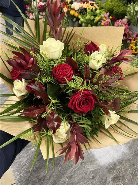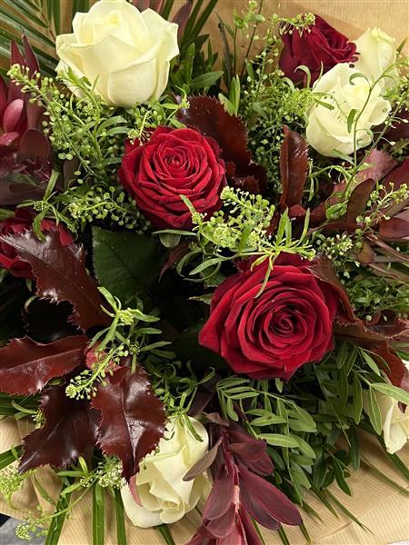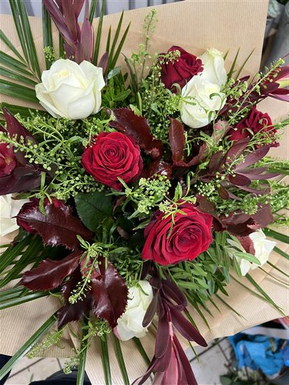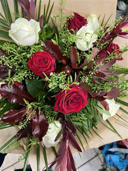 We will use six red and six white roses arranged with nice foliage into an aqua hand tied bouquet.