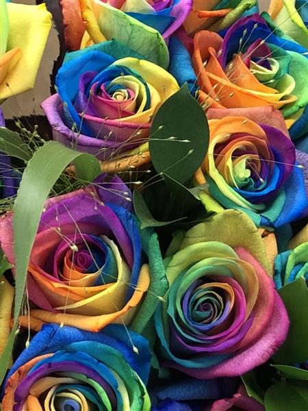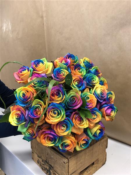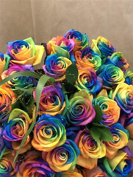 30 Rainbow Roses Hand Tied and Gift Wrapped. Arrives in Floral Foam or Water for guaranteed freshness.