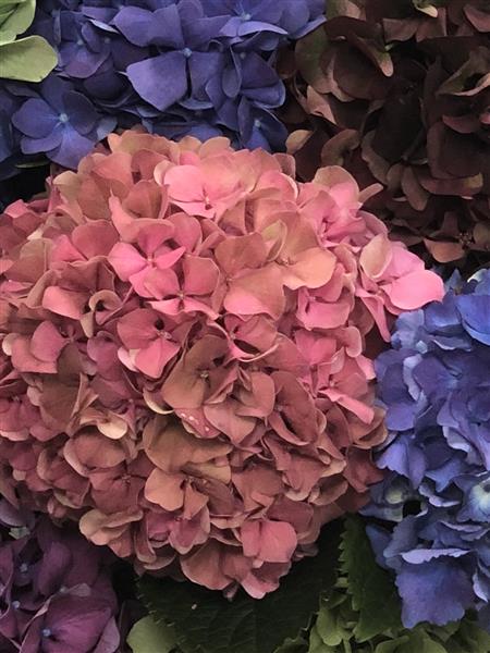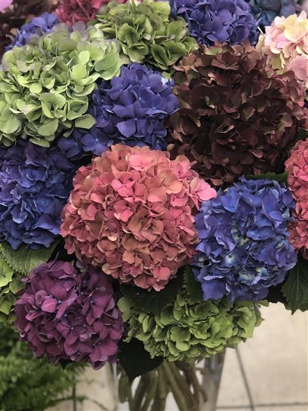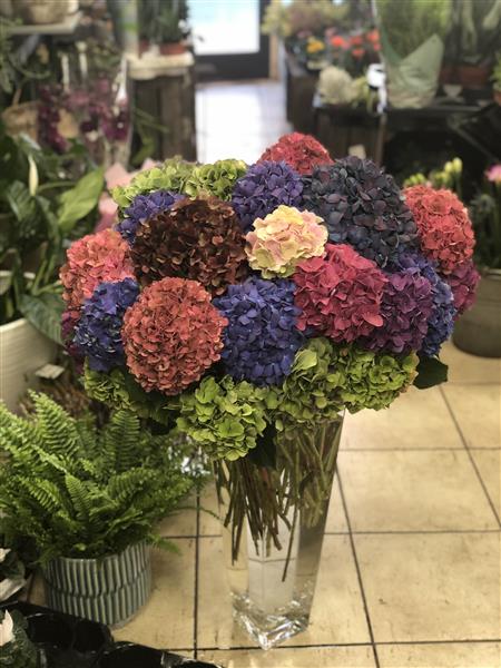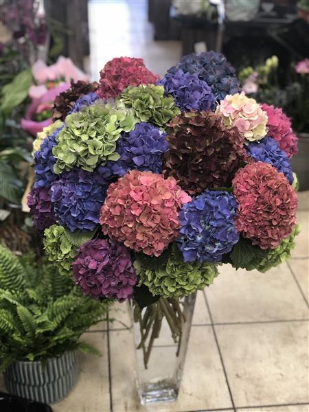 35 Mixed Large headed Hydrangeas hand tied into a tall vase.