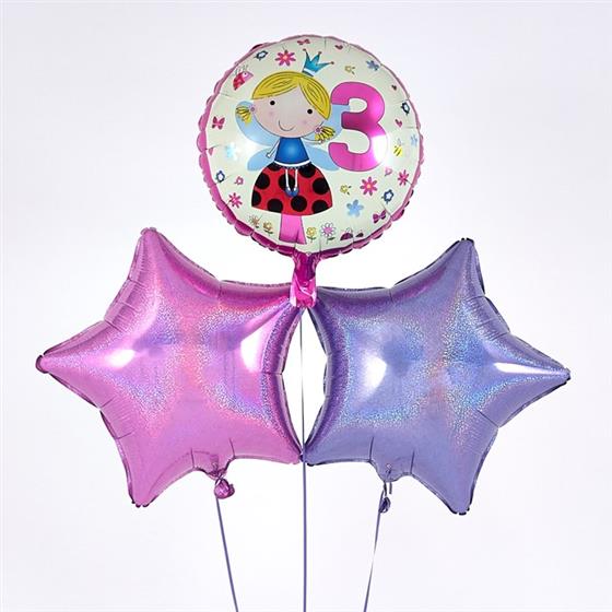 This eye-catching 3rd Birthday balloon bouquet is radiant with an array of Pink and Lilac metallic colours – just right for a 3rd Birthday. The Star and Circular 45cm micro-foil balloons arrive filled with helium and tied to a weight with curling ribbon decorations.