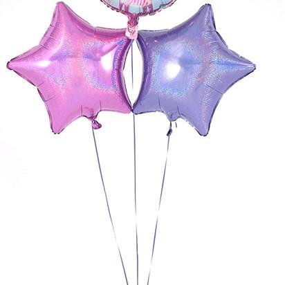 This eye-catching 4th Birthday balloon bouquet is radiant with an array of Pink and Lilac metallic colours – just right for a 4th Birthday. The Star and Circular 45cm micro-foil balloons arrive filled with helium and tied to a weight with curling ribbon decorations.