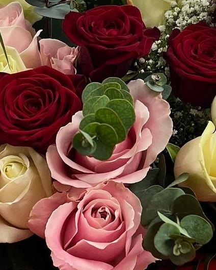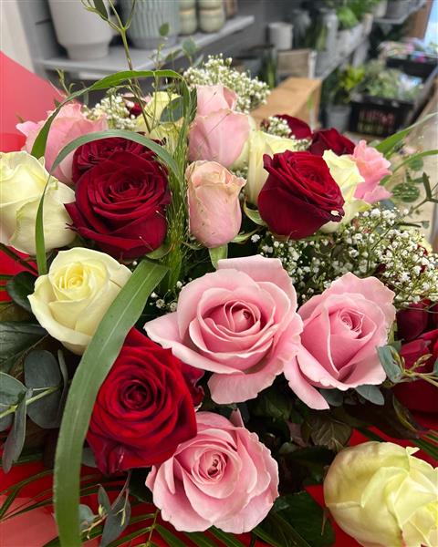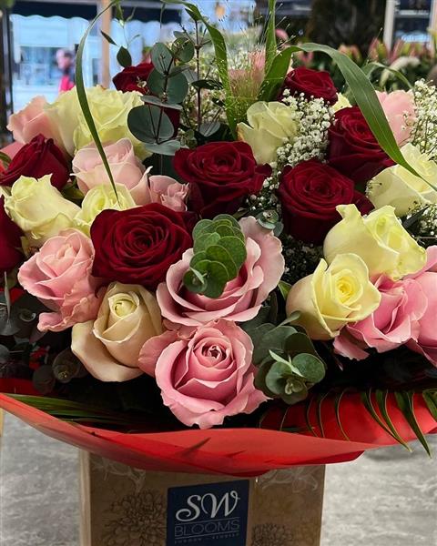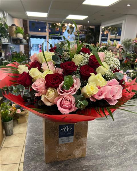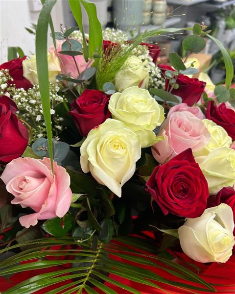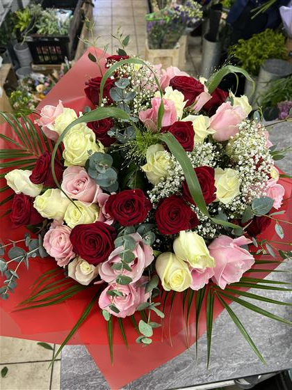 This beautifully arranged bouquet has 50 mixed red, pink and white avalanche and Naomi roses.