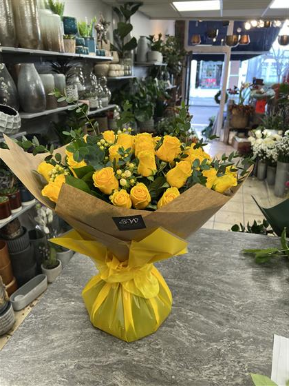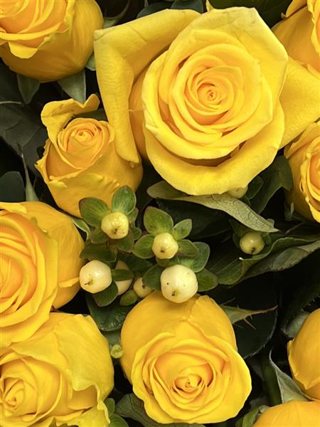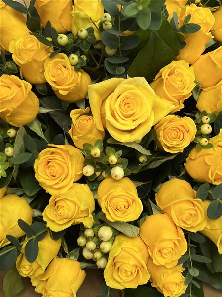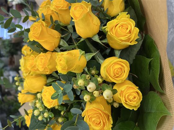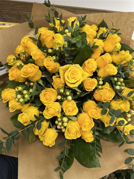 50 Yellow Roses with fillers and foliage. Pictured is Penny Lane Dutch roses and Hypericum berries with Eucalyptus.