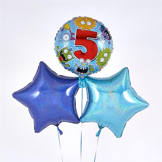 This eye-catching 5th Birthday balloon bouquet is radiant with an array of Blue metallic colours – just right for a Childs 5th Birthday. The Star and Circular 45cm micro-foil balloons arrive filled with helium and tied to a weight with curling ribbon decorations.