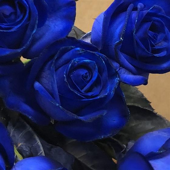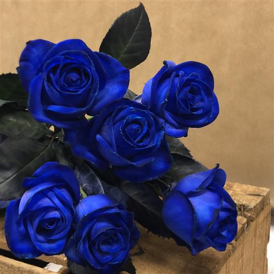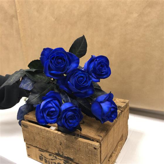 6 Fresh Blue Roses Hand tied and gift wrapped with a vase.