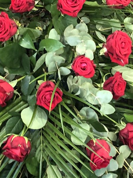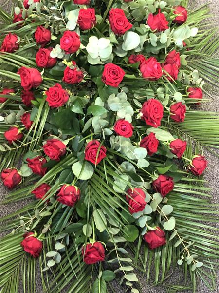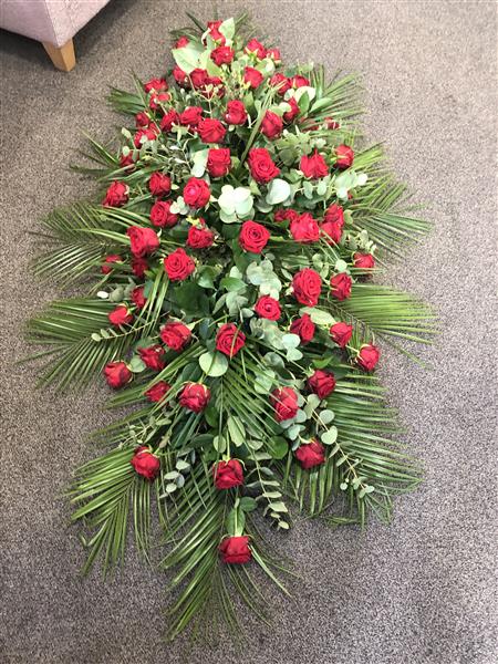 6 Foot Red Rose Coffin Spray. We will order the Red Roses in 3 days before to get them perfectly opened for the funeral.