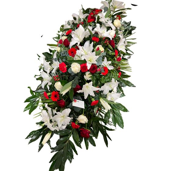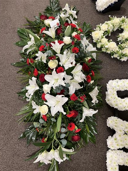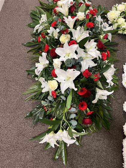 Are 6 foot long red and white mixed flower coffin spray. Made with beautiful open white lilies, red roses, white roses, red tulips, red Gerberas, mixed foliage including eucalyptus and palm leaves.