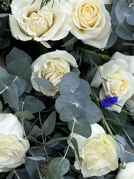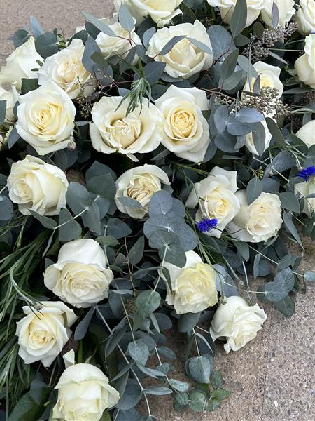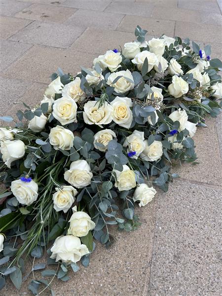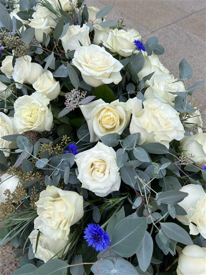 6 foot White Rose coffin spray using lots of Eucalyptus and a touch of blue cornflowers.