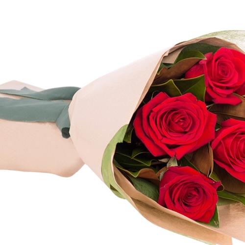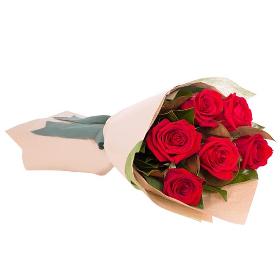 6 Red Roses Long Stem large head with some hand picked mixed foliage. Stems left long approx 70 cm. Wrapped up in Paper with a bow. Plain and simple natural look.