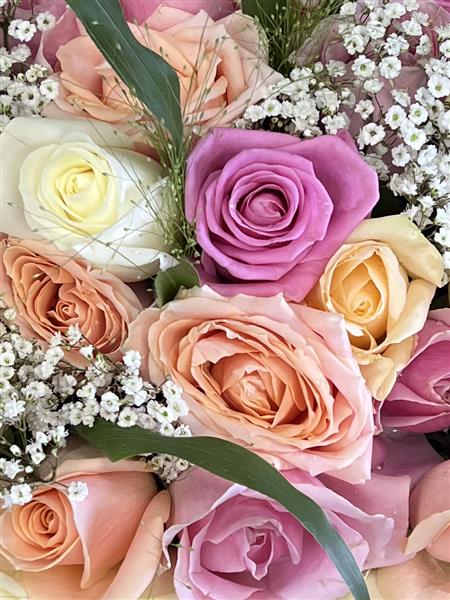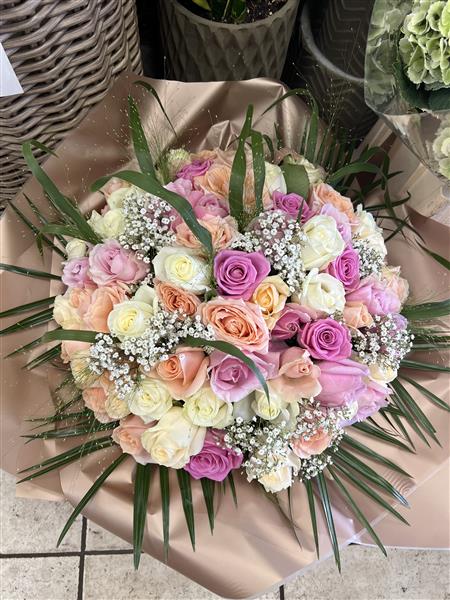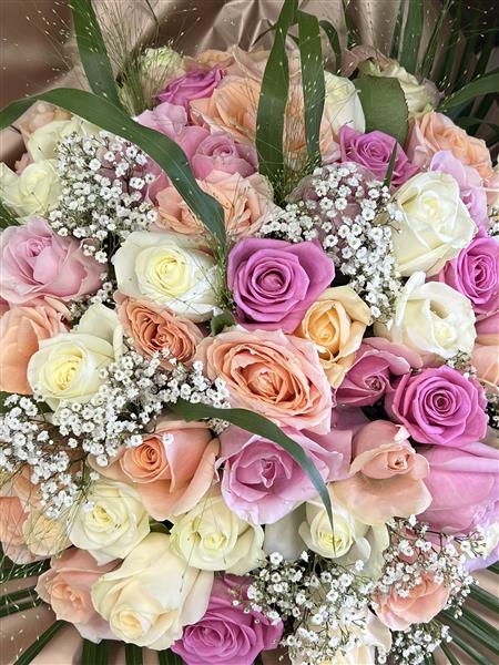 80 Large Headed Roses using Pearl Avalanche, Pink Avalanche, White Avalanche, ButterCup Avalanche, Pink Aqua Roses with eucalyptus, Panicum and Gyp.