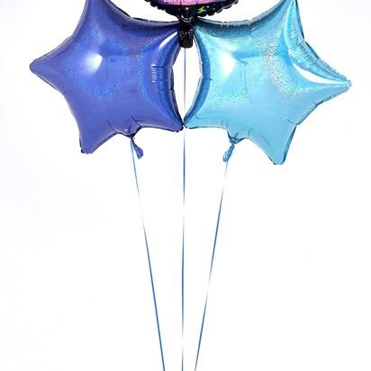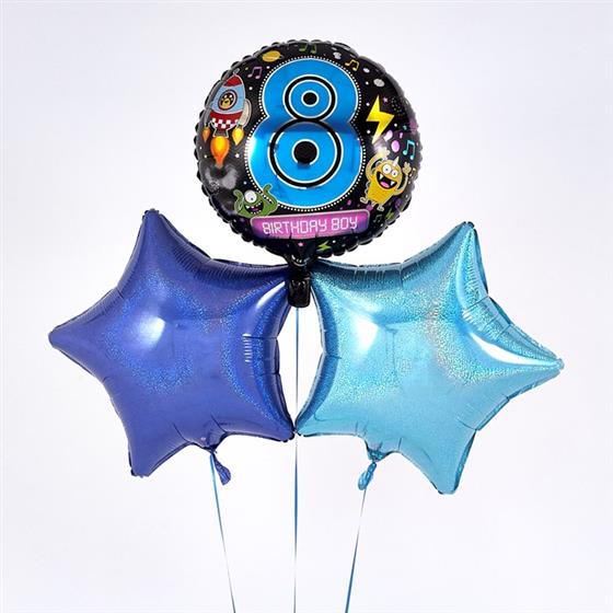 This eye-catching 8th Birthday balloon bouquet is radiant with an array of Blue metallic colours – just right for a Childs 8th Birthday. The Star and Circular 45cm micro-foil balloons arrive filled with helium and tied to a weight with curling ribbon decorations.