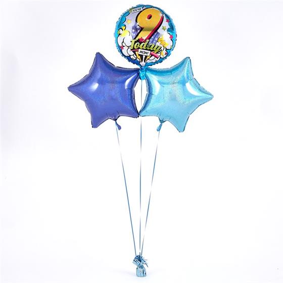 This eye-catching 9th Birthday balloon bouquet is radiant with an array of Blue metallic colours – just right for a Childs 9th Birthday. The Star and Circular 45cm micro-foil balloons arrive filled with helium and tied to a weight with curling ribbon decorations.