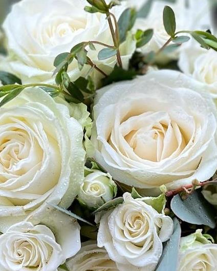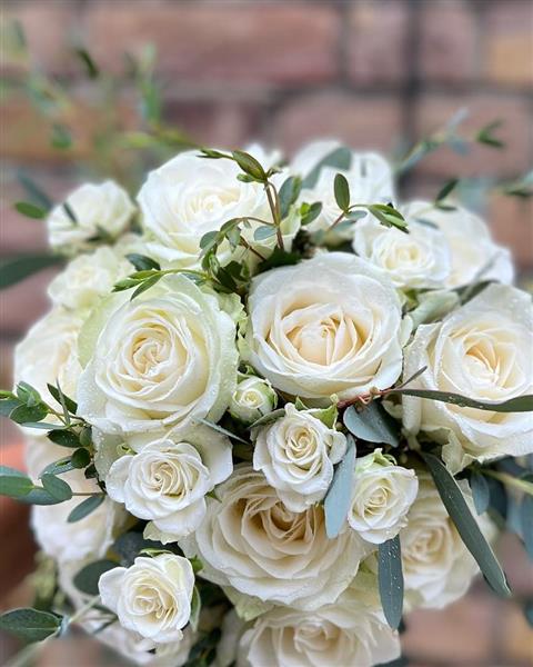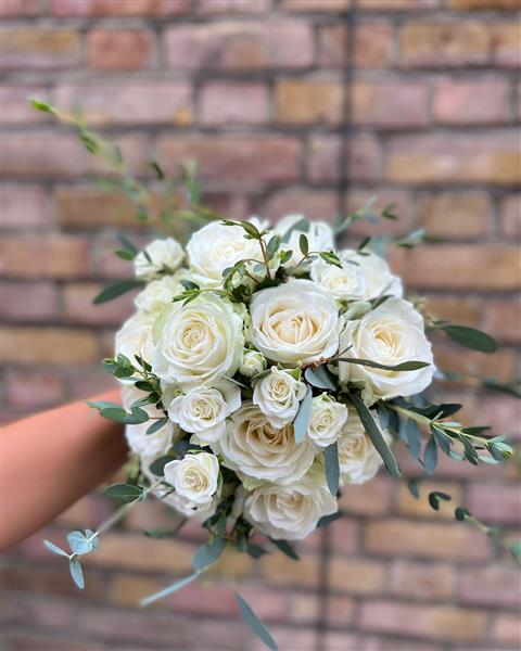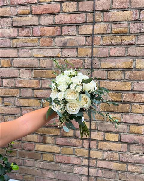 We will expertly arrange your bridal bouquet using white avalanche roses and white spray roses. We will ensure they will be perfectly open for the day. We will compliment them with a mix of eucalyptus Victoria, Cinerea and Parvi. These all give the bouquet a differnet but effective delicate look. Finished off with a natural tie or ribbon around the stems.