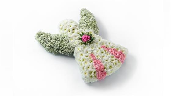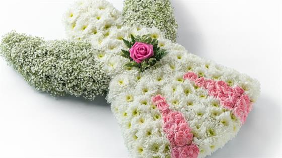 A moving tribute suitable for any age, this white angel is created with an abundance of double chrysanthemums and trimmed with pretty pink spray carnations and large pink rose centrepiece framed with leather leaf and pittosporum. Gypsophila is used to create the delicate wing shapes