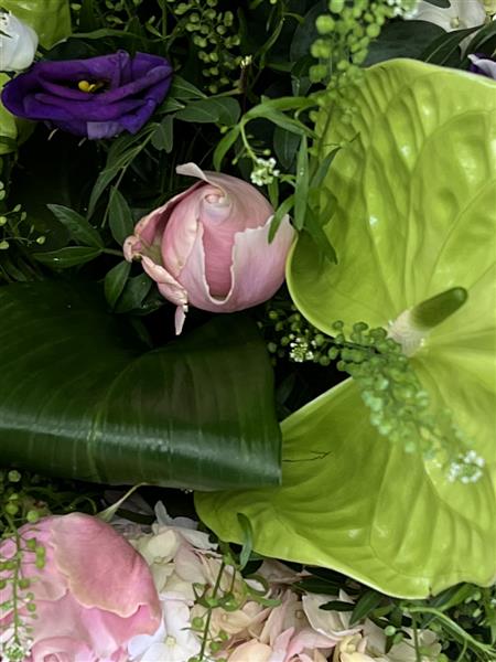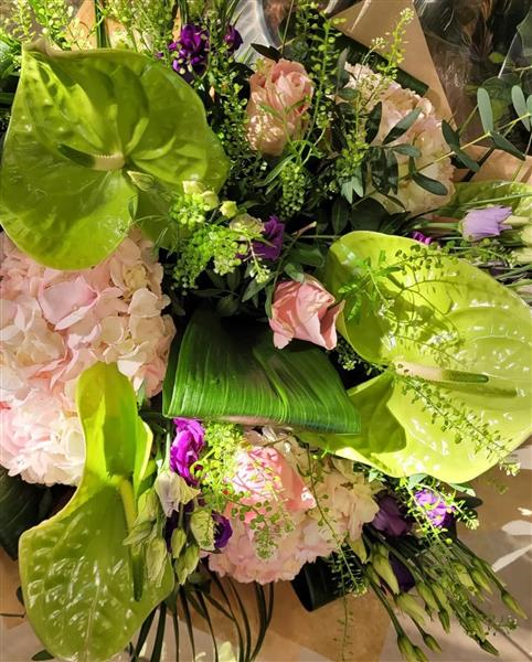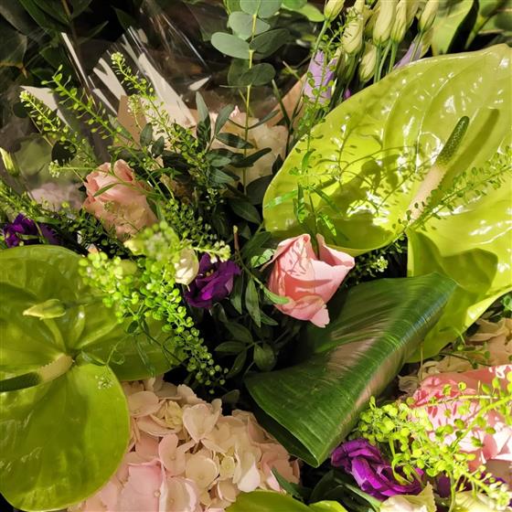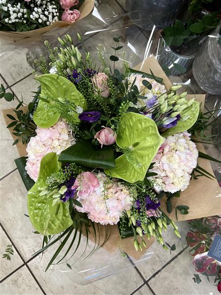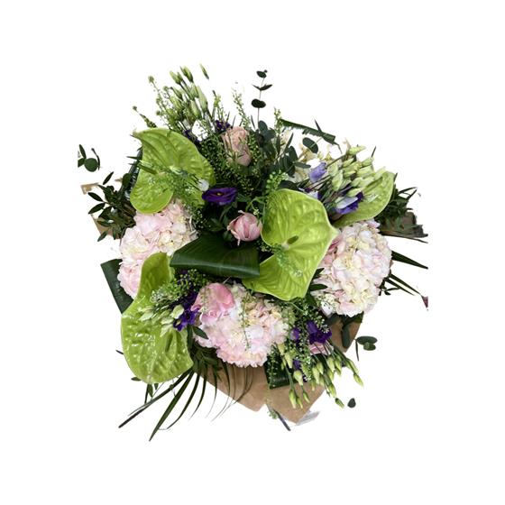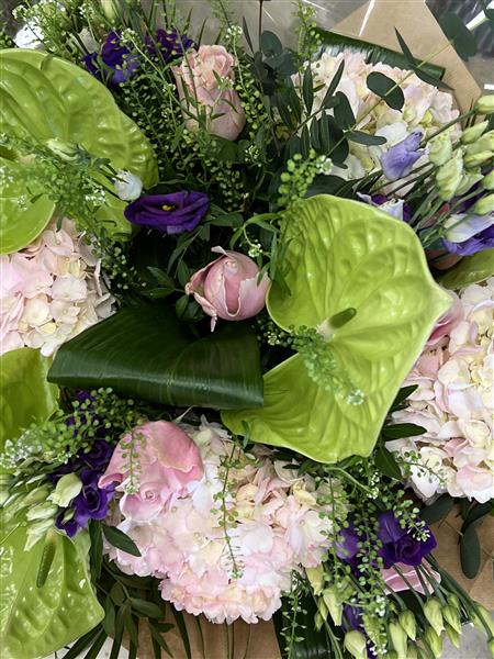 Large Hand tied with Pink Hyrdangeas, Pink avalanche roses, bright lime green anthuriums, purple Lisianthus, Greenbell Thlaspi and Eucalyptus.