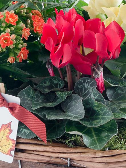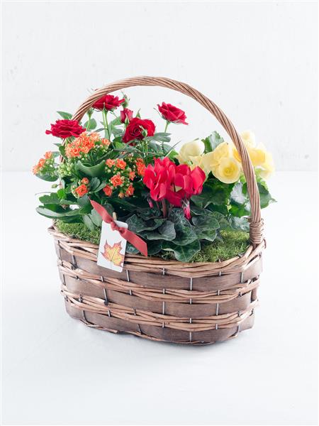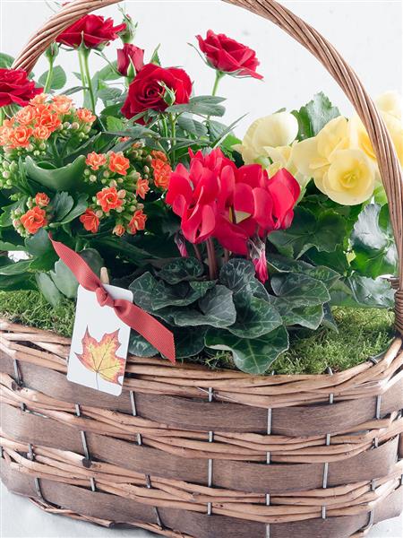 Featuring a red rose plant, orange kalandiva, yellow begonia and a red cyclamen, planted in an oval woven basket, trimmed with a ribbon and gift tag.