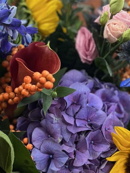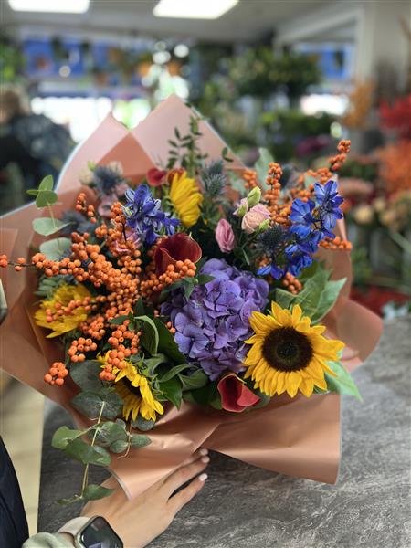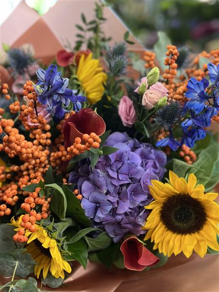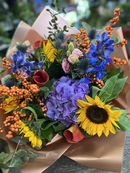 Sunflowers, Ilex Berries, Lisianthus, Roses, Blue Delph and Hydrangeas,