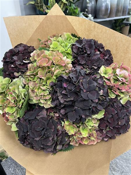 A beautiful Hand tied of 10 Autumnal Hydrangeas