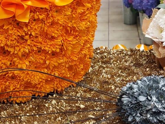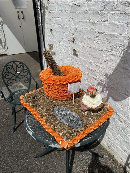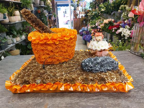 We made a mixing bowl, wooden spoon, cupcake and a whisk out of flowers sitting onto a nice base.