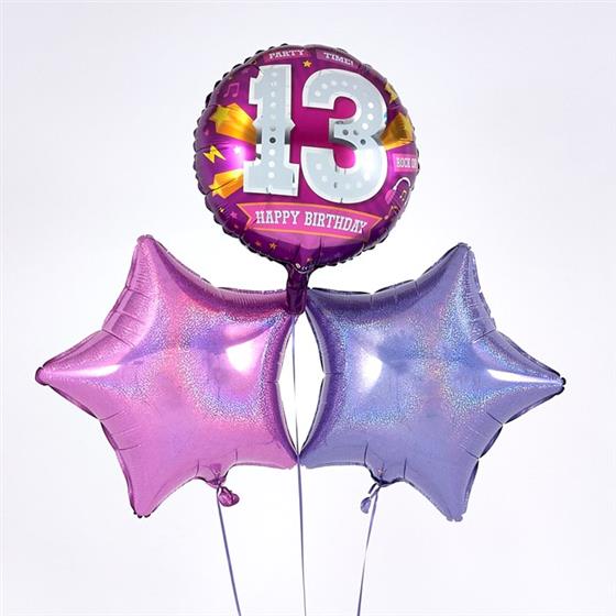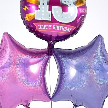 This eye-catching 13th Birthday balloon bouquet is radiant with an array of Pink and Lilac metallic colours – just right for a 13th Birthday. The Star and Circular 45cm micro-foil balloons arrive filled with helium and tied to a weight with curling ribbon decorations.