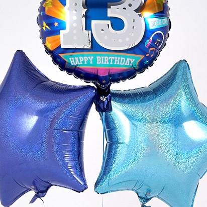 This eye-catching 13th Birthday balloon bouquet is radiant with an array of Blue metallic colours – just right for a Childs 13th Birthday. The Star and Circular 45cm micro-foil balloons arrive filled with helium and tied to a weight with curling ribbon decorations.