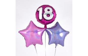 This eye-catching 18th Birthday balloon bouquet is radiant with an array of Pink metallic colours and silver sparkles – just right for getting into the party mood. The Circular and Star 45cm micro-foil balloons arrive filled with helium and tied to a weight with curling ribbon decorations.