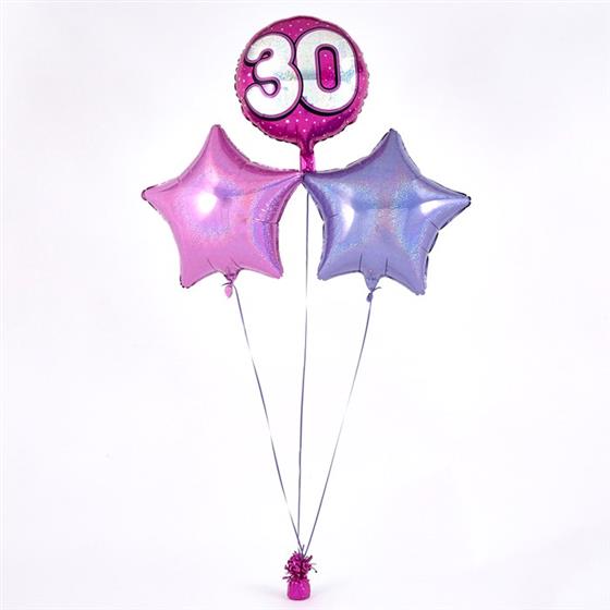 This eye-catching 30th Birthday balloon bouquet is radiant with an array of Pink and Lilac metallic colours – just right for a 30th Birthday. The Star and Circular 45cm micro-foil balloons arrive filled with helium and tied to a weight with curling ribbon decorations.