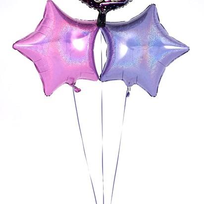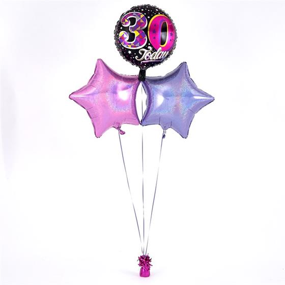 This eye-catching 30th Birthday balloon bouquet is radiant with an array of Black, Pink and Lilac metallic colours – just right for a 30th Birthday. The Star and Circular 45cm micro-foil balloons arrive filled with helium and tied to a weight with curling ribbon decorations.