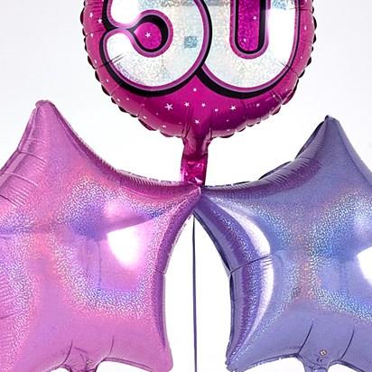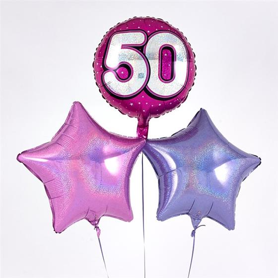 This eye-catching 50th Birthday balloon bouquet is radiant with an array of Pink and Lilac metallic colours – just right for a 50th Birthday. The Star and Circular 45cm micro-foil balloons arrive filled with helium and tied to a weight with curling ribbon decorations.