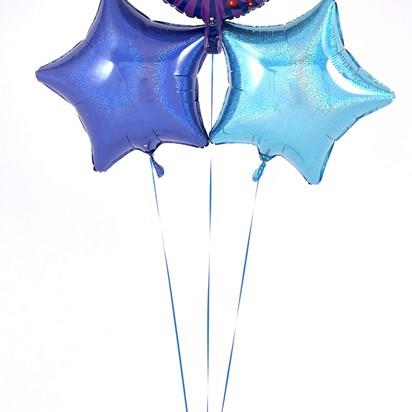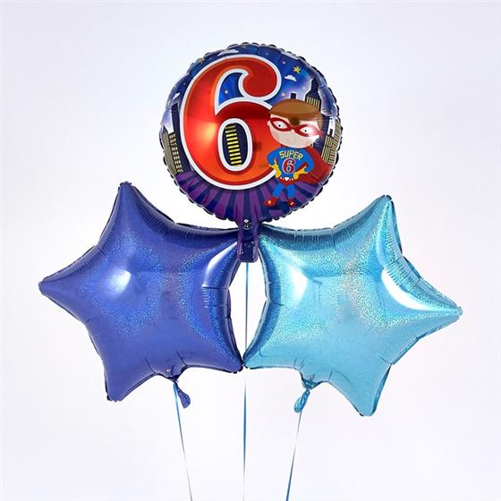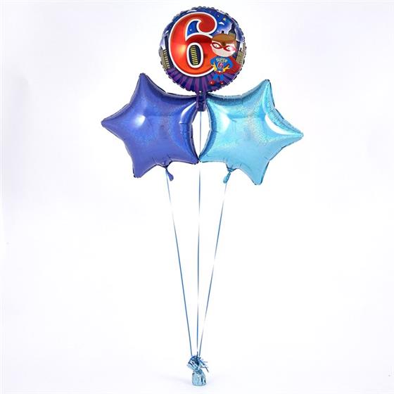 This eye-catching 6th Birthday balloon bouquet is radiant with an array of Blue metallic colours – just right for a Childs 6th Birthday. The Star and Circular 45cm micro-foil balloons arrive filled with helium and tied to a weight with curling ribbon decorations.