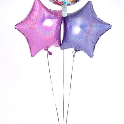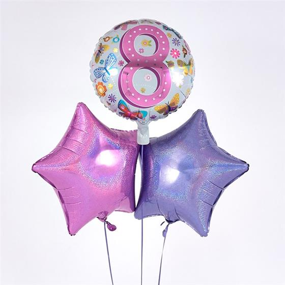 This eye-catching 8th Birthday balloon bouquet is radiant with an array of Pink and Lilac metallic colours – just right for a 8th Birthday. The Star and Circular 45cm micro-foil balloons arrive filled with helium and tied to a weight with curling ribbon decorations.