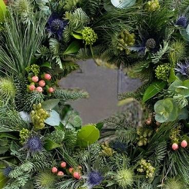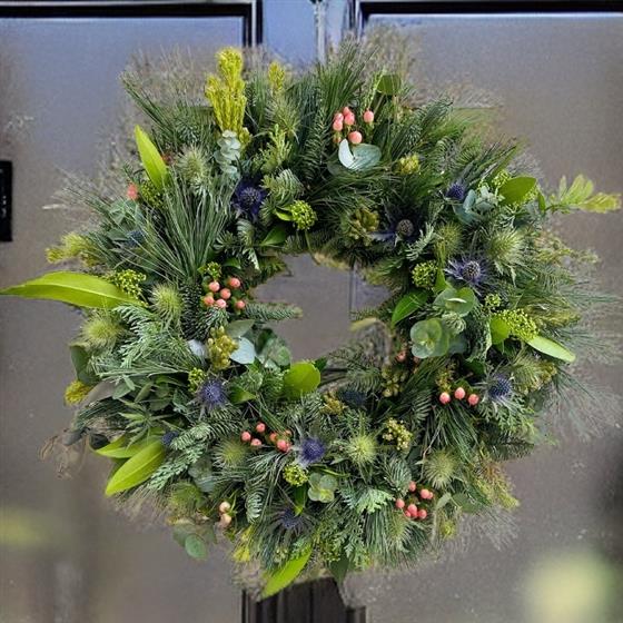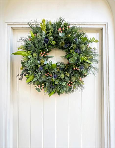 A beautiful Pink Berry, Green Skimmia and Blue Eryngium Thistle Door Wreath. Made onto an oasis frame for freshness it can be resoaked to make it last through the festive period.
