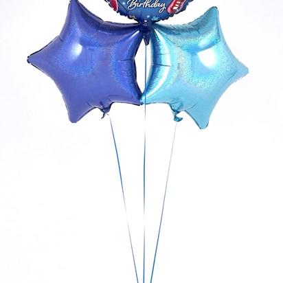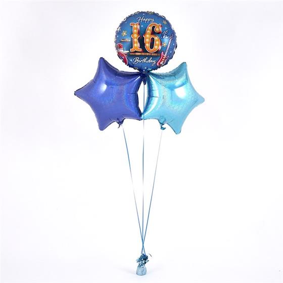 This eye-catching 16th Birthday balloon bouquet is radiant with an array of Blue metallic colours – just right for a Childs 16th Birthday. The Star and Circular 45cm micro-foil balloons arrive filled with helium and tied to a weight with curling ribbon decorations.