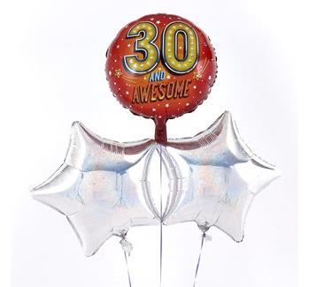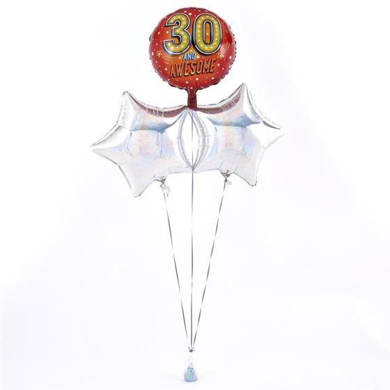 This eye-catching 30th Birthday balloon bouquet is radiant with an array of Orange and Silver metallic colours – just right for a 30th Birthday. The Star and Circular 45cm micro-foil balloons arrive filled with helium and tied to a weight with curling ribbon decorations.