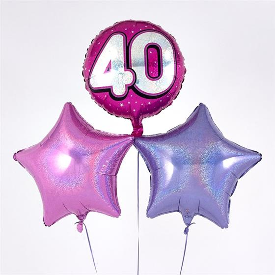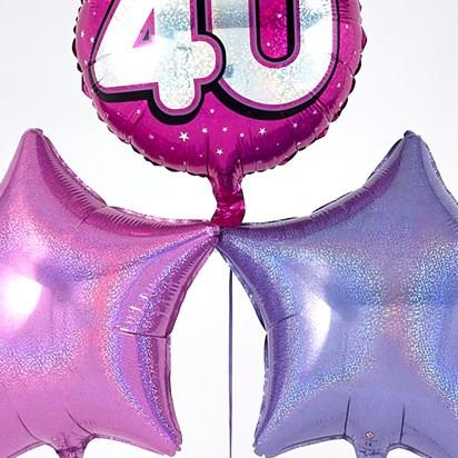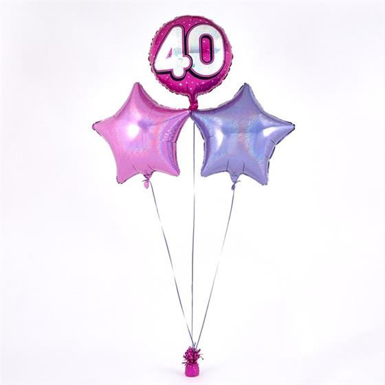 This eye-catching 40th Birthday balloon bouquet is radiant with an array of Pink and Lilac metallic colours – just right for a 40th Birthday. The Star and Circular 45cm micro-foil balloons arrive filled with helium and tied to a weight with curling ribbon decorations.