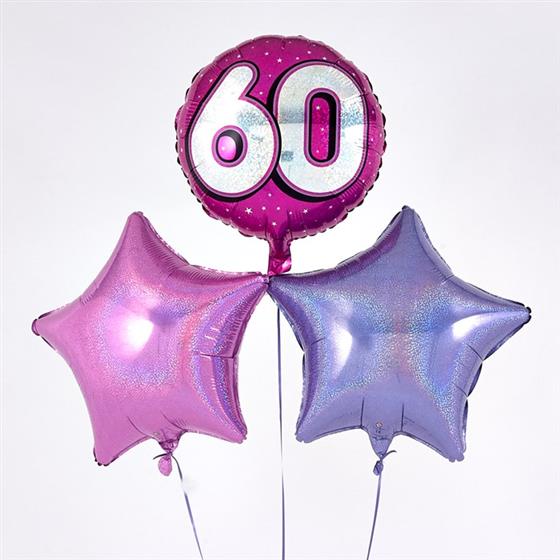 This eye-catching 60th Birthday balloon bouquet is radiant with an array of Pink and Lilac metallic colours – just right for a 60th Birthday. The Star and Circular 45cm micro-foil balloons arrive filled with helium and tied to a weight with curling ribbon decorations.