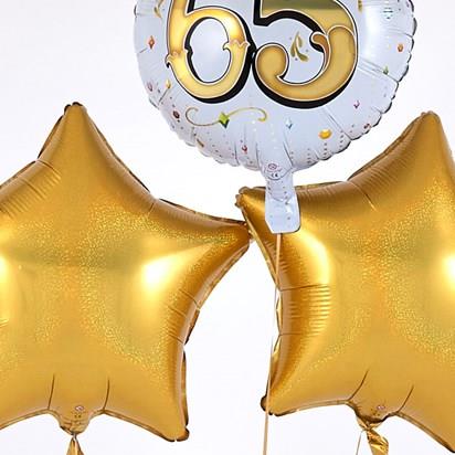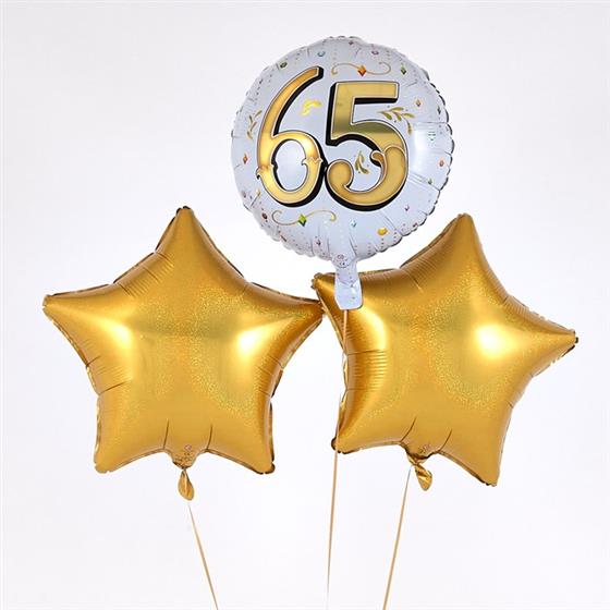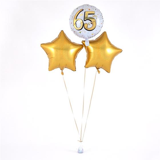 This eye-catching 65th Birthday balloon bouquet is radiant with an array of White and Gold metallic colours – just right for a 65th Birthday. The Star and Circular 45cm micro-foil balloons arrive filled with helium and tied to a weight with curling ribbon decorations.