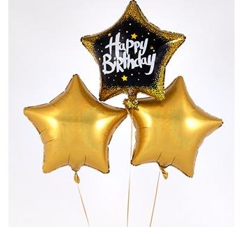 This eye-catching Birthday balloon bouquet is radiant with an array of Gold metallic colours and sparkles – just right for getting into the party mood. The Star shaped 45cm micro-foil balloons arrive filled with helium and tied to a weight with curling ribbon decorations.