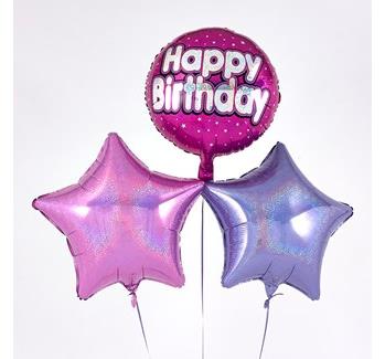 This eye-catching Birthday balloon bouquet is radiant with an array of Pink metallic colours and silver sparkles – just right for getting into the party mood. The Circular and Star 45cm micro-foil balloons arrive filled with helium and tied to a weight with curling ribbon decorations.