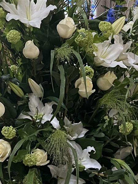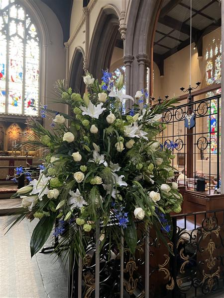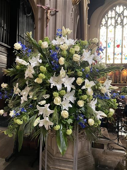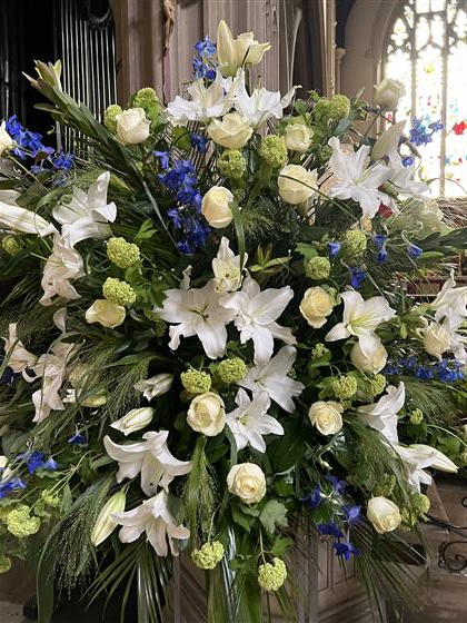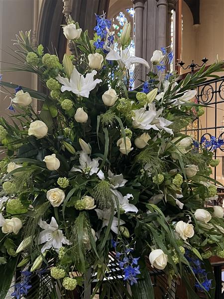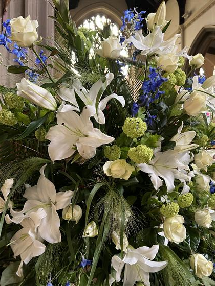 Open White Lily, White Avalanche Roses, Green Viburnums, Blue delphiniums, Mixed foliage including Panicum Fountain grass.