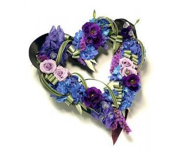 Blue and Lilac open Heart with Beautiful Blue Hydrangeas, Lilac memory lane roses, Purple lisianthus and mixed foliage.