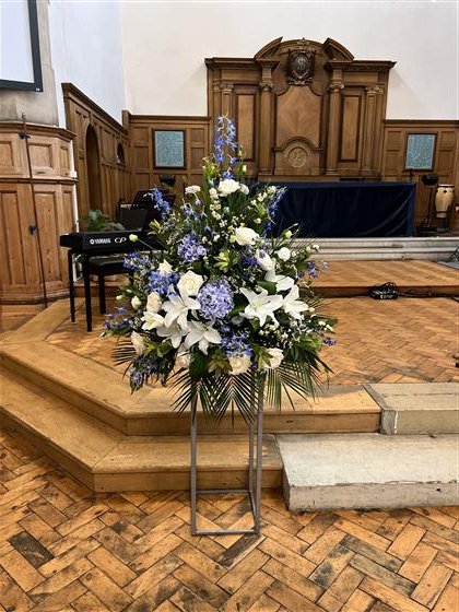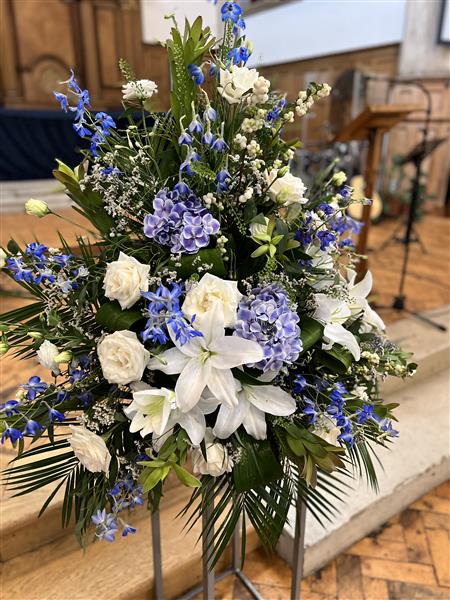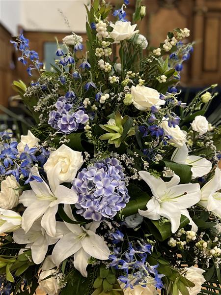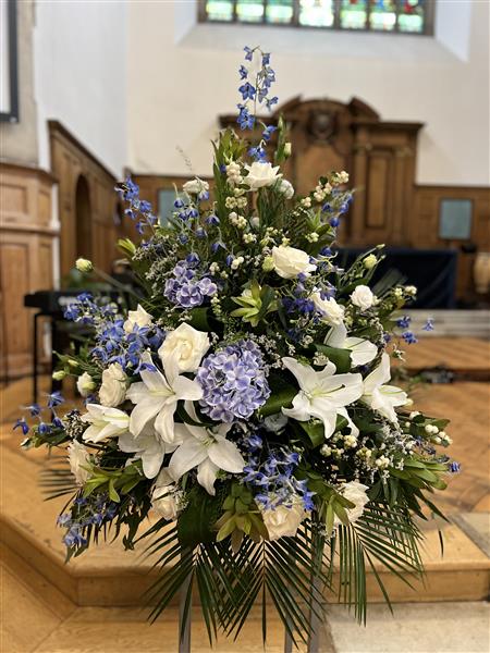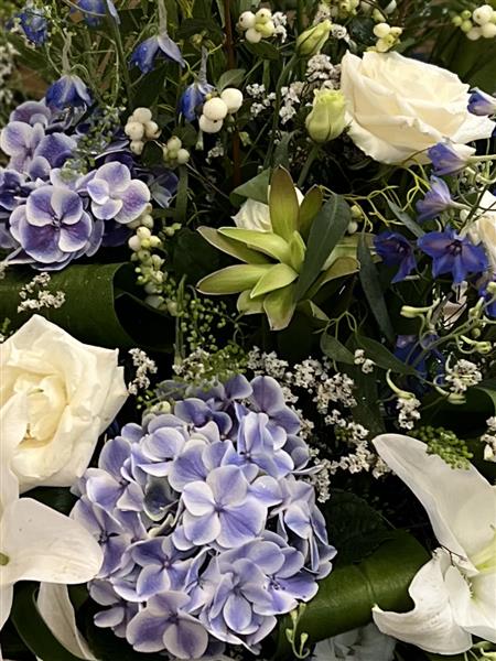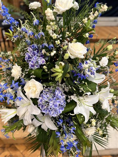 Using Blue Delphiniums, Blue Hydrangeas, White Roses, Lily’s, White Snow Berries, White Lisianthus, white limonium fillers and a selection of choice foliage.