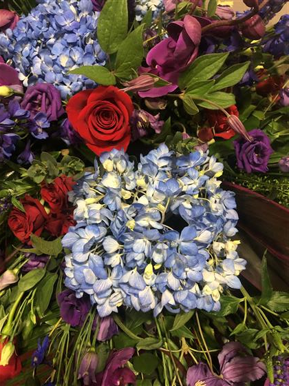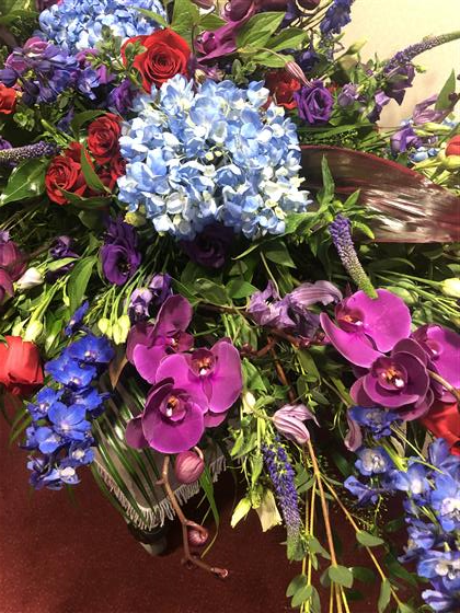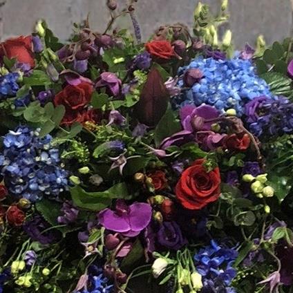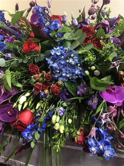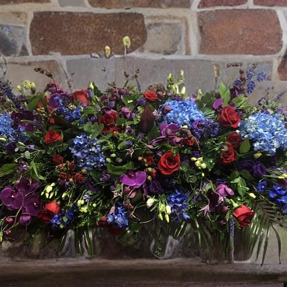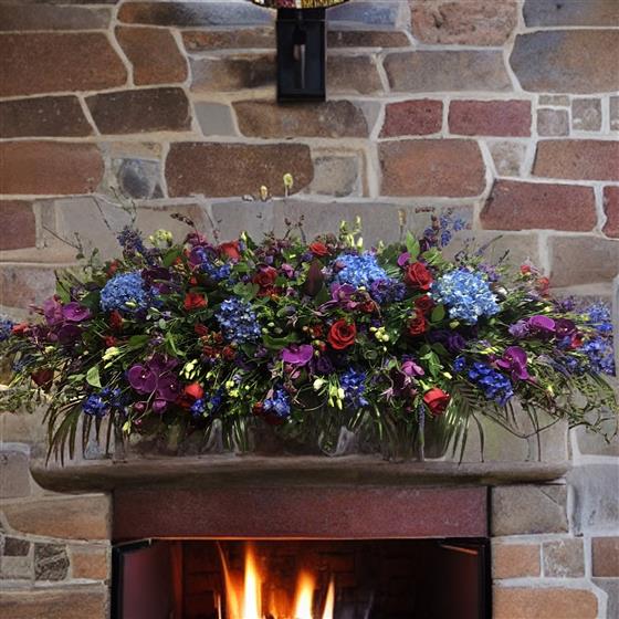 A 6 foot long and full fireplace arrangement using Blue Hydrangeas, Red Naomi Roses, Purple Orchids, Red Spray Roses, Purple Lisianthus, Red Dracena Leaves, Thlaspi foliage, Purple Veronicas, Blue Delphinium and a mix of eucalyptus foliage.