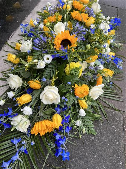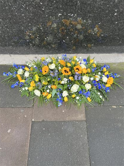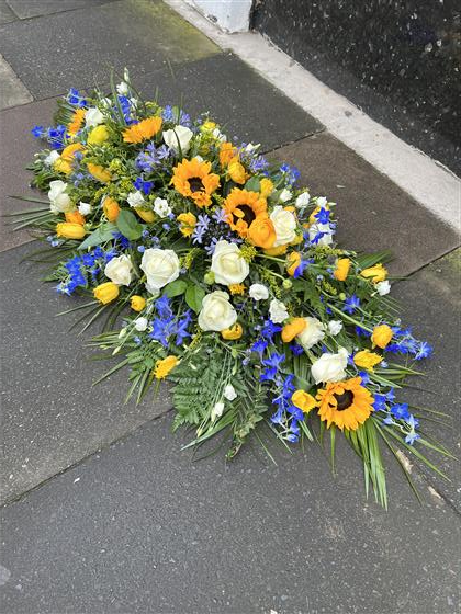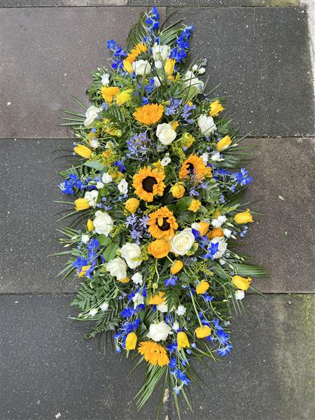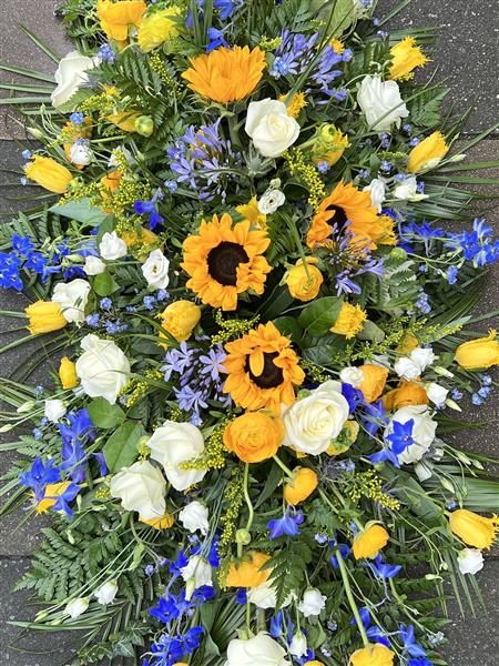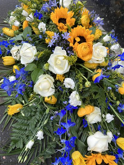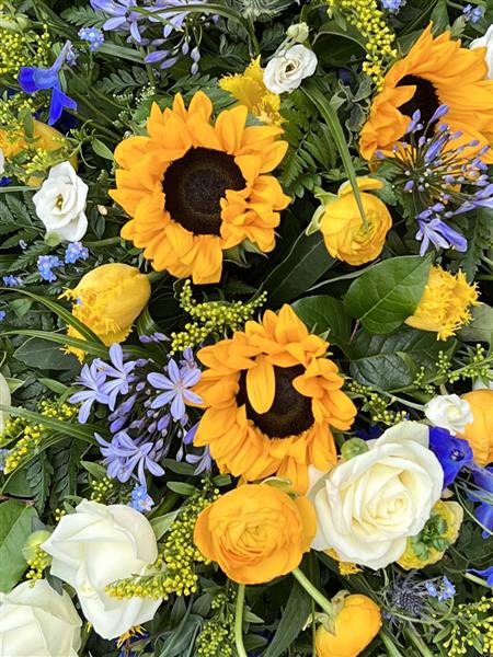 A beautiful bright Yellow, Blue and White coffin spray using the finest flowers. Blue Delphinium, White Roses, Yellow Sunflowers, Yellow Ranunculus, Yellow Tulips, Blue Agapanthus, White Lisianthus, Soli, Eucalytpus, Ferns and Palm leaves.