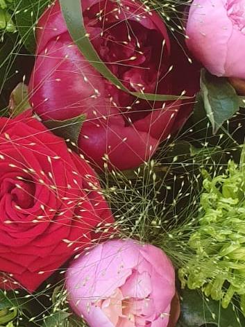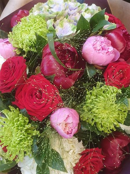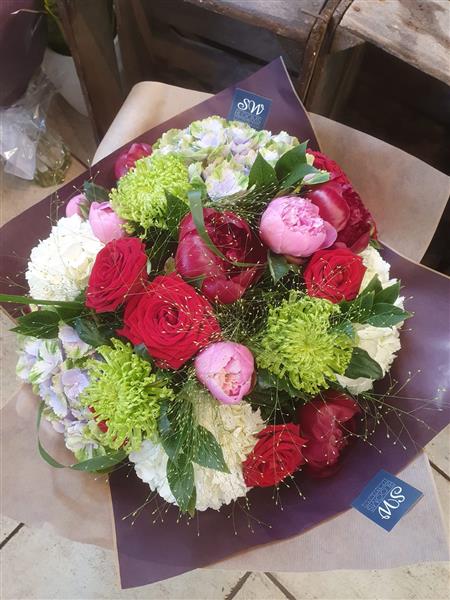 A Bright Summer Hand tied of Peonies, Hydrangeas, Roses, Shamrocks and Peonies with foliage hand tied into water.