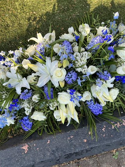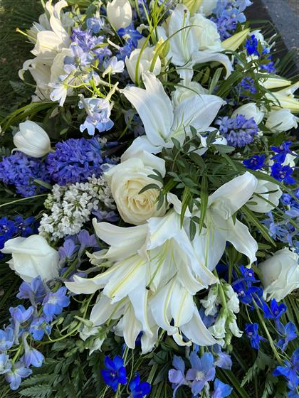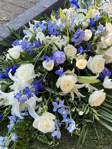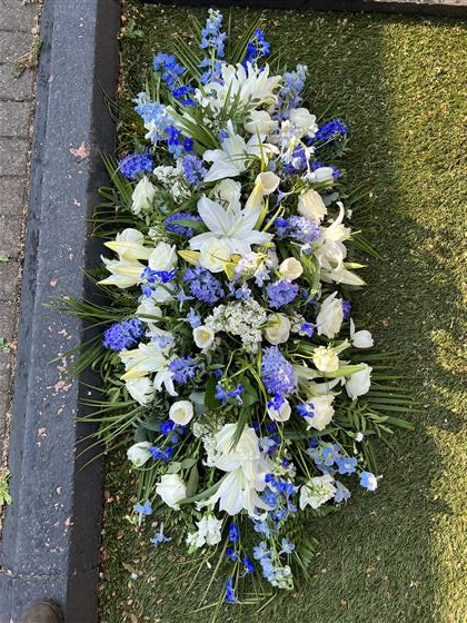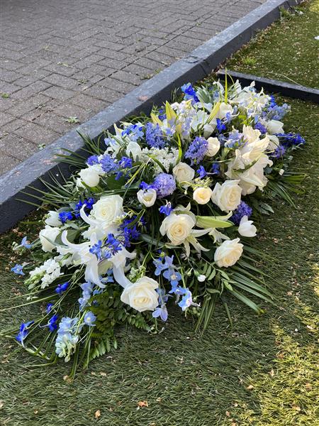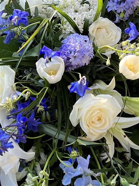 A 5 foot coffin spray with White Lily, Roses, Tulips, Lisianthus, Blue Delphiniums, Hyacinths and