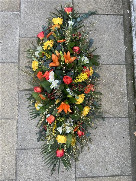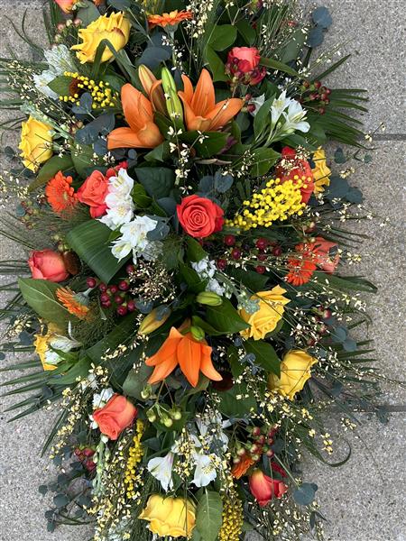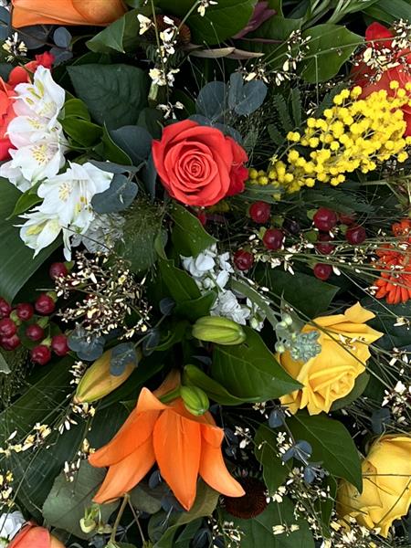 Using a mix of bright seasonal flowers we could include Yellow and Orange Roses, Orange Lily’s, Mimosa, Ginister, Alstro, Antirinums, Soli and a nice selection of mixed foliage.
