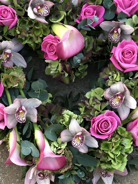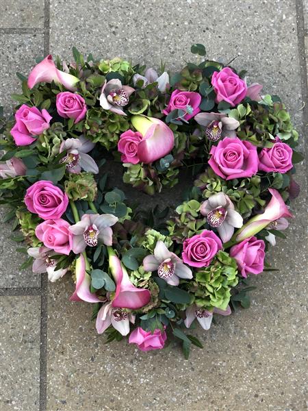 A bright Pink open Heart Tribute with Calla Lily’s, Cymbidium Orchids, Bright Cerise Roses, Green Hydrangeas and Mixed Foliage.