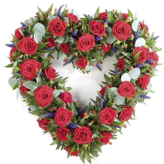 A beautiful tribute of deep reds including roses and contrasting purples with mixed foliage. Available as pictured or in a range of colours.