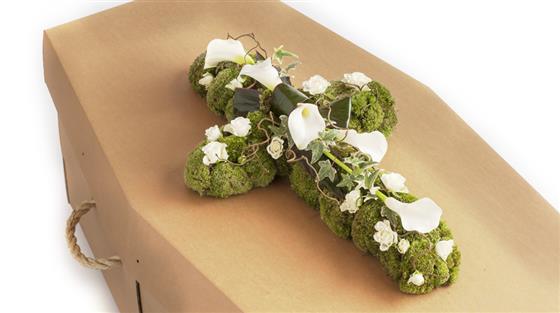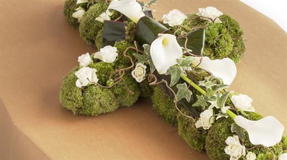 The blanket of bun moss makes a very soft and velvety bed for these graceful calla lilies and roses in pristine white. We’ve used ivy trails and willow to add to the natural feel of this traditional cross-shaped tribute. This design is offered in a choice of three sizes.